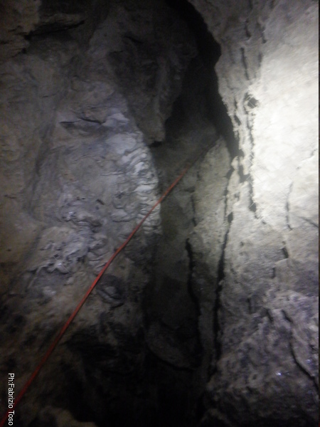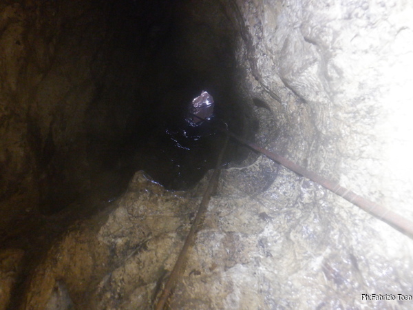 Dopo 10 metri di discesa servirebbe un frazionamento ma non lo trovo. Provo a continuare la discesa e finalmente trovo un fix pero’ noto che e’ troppo in basso e 5 metri piu’ in alto la corda struscia malamente sulla parete. Risalgo con cautela e uso un cordino per armare un frazionamento su uno spuntone di roccia. Meglio. Inverto la direzione e scendo fino alla base del pozzo. Qua, spostandomi in piano nello stretto di un paio di metri potrei scendere ancora ma visto che il posto e’ anche ingombro di sassi decido di desistere. Mi limito a lanciare qualche sasso di sotto e valuto si tratti di un altro P10.