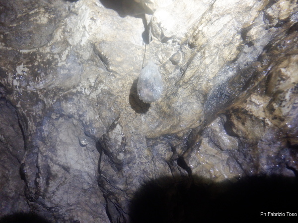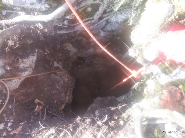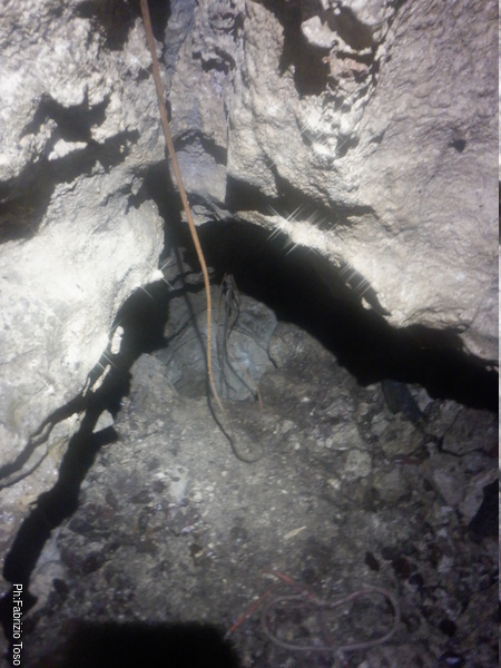 Gli amici che hanno visitato questa grotta prima di me hanno detto che ancora piu’ sotto c’e’ un muretto a secco, testimonianza di una precedente esplorazione a opera di ignoti, e un altro pozzo di almeno 40 metri con la partenza da allargare.