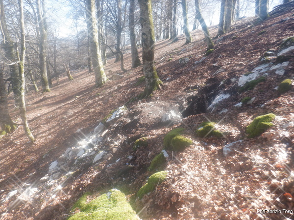 Lungo il sentiero, ora sono in direzione di pian dell’erdigheta e dell’abisso Consolini, trovo tracce di quello che mi sembra una grotta brutalmente tappata, mi fermo a guardare ma ci vorrebbe troppo lavoro per verificare.