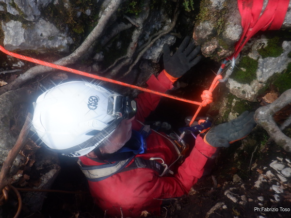 Con un poco di fatica e altrettanta fortuna riusciamo a trovare l’ingresso della grotta che cercavo. Forte della compagnia di Laura decido di andare dentro a dare uno sguardo. Mentre mi preparo lei fa la sua parte provvedendo all’armo iniziale. Si tratta di un pozzo di una trentina di metri, la partenza non e’ larghissima ma nemmeno troppo impegnativa.