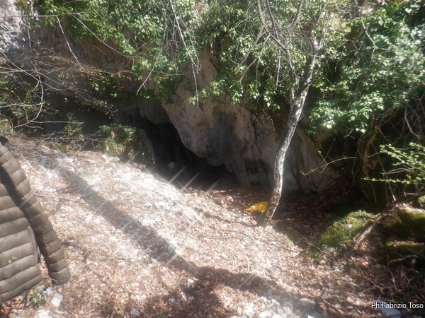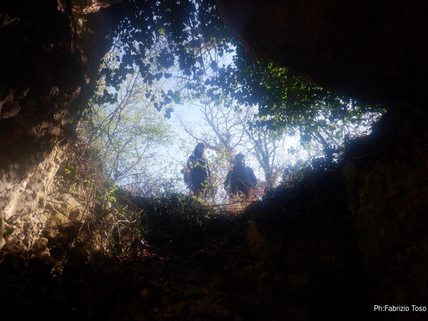 Il richiamo di Gabriele, il nostro faro GPS, ci consiglia di uscire da fosso spinoso e girare verso destra, cosa che facciamo prontamente. Terminata la salita per il fianco del fosso, in pochi metri ci troviamo al cospetto di uno scavernamento di tutto rispetto. Scendiamo a dare uno sguardo.