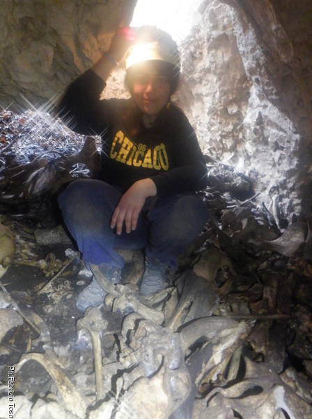 Oltre alle ossa c’e’ poco da vedere, per scrupolo controlliamo in fondo alla grotta nel caso ci fossero buchi con speranza di prosecuzione. Guardo ma spero di trovare nulla, non mi piacerebbe scavare in questa grotta. Prima di uscire Alice arrotola una sigaretta, un “drummino”, e ne usa il fumo per controllare alcuni buchi vicino alla base del pozzo d’ingresso. Nulla di rilevante.