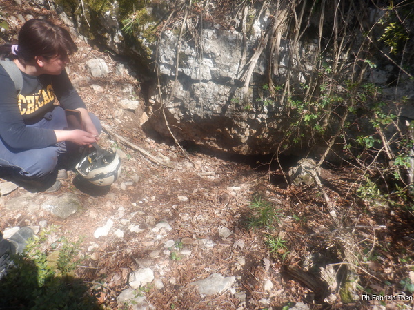Riprendiamo la nostra passeggiata, la prossima meta sara’ la Grotta grande di Muro Pizzo ma strada facendo troviamo un altro buco che potrebbe essere interessante. Alice utilizza di nuovo il fumo del drummino per saggiare l’aria che esce dalla frattura. Qualcosa c’e’ ma nulla di interessante.
