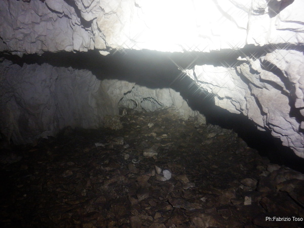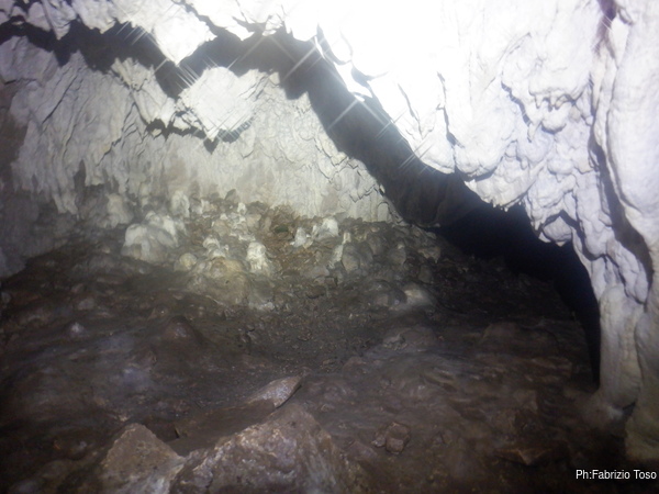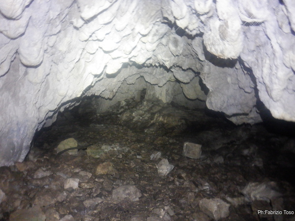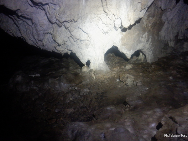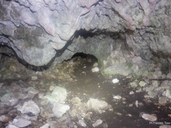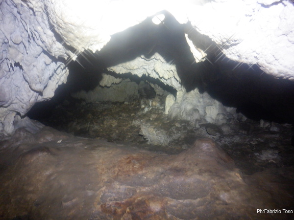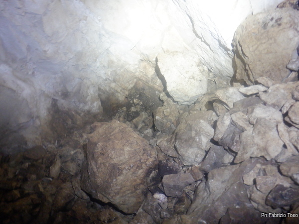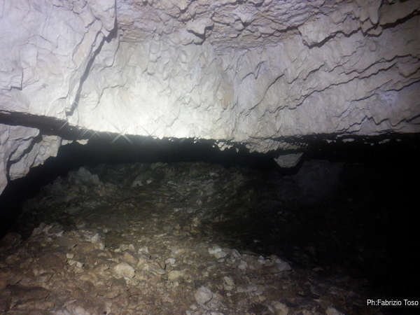 Per prima cosa mi tengo a destra seguendo la parete perimetrale, passo un punto in cui il soffitto e’ basso e mi trovo in un ambiente in cui si procede a quattro zampe fino a dove il soffitto si abbassa di piu’ e si nota della terra.