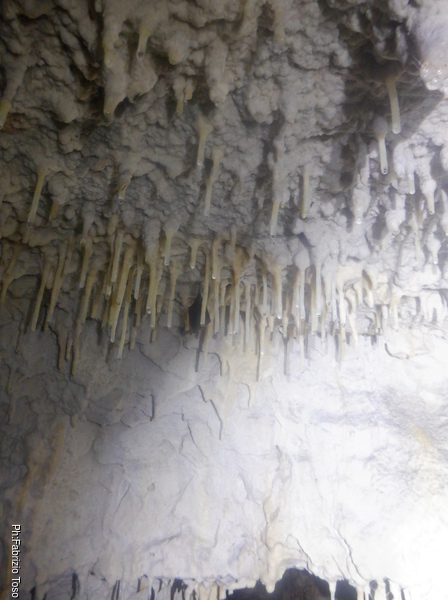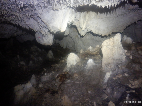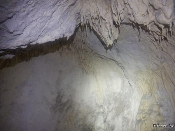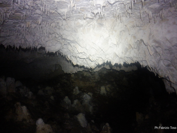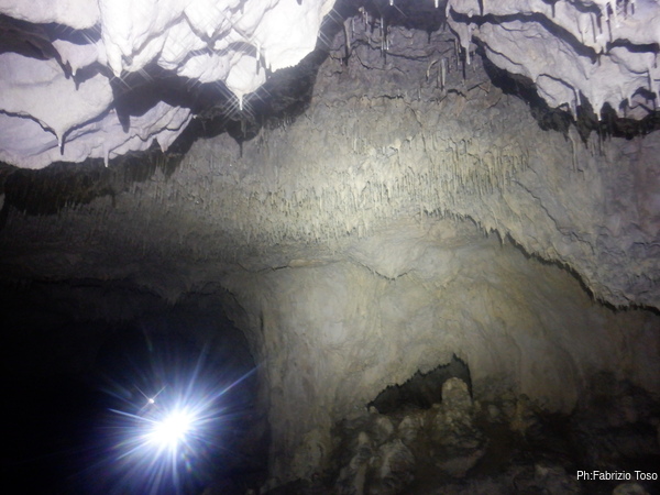 Passato alla sala piu’ interna inizio a girare, meravigliato dalla vastita’ inaspettata di ambienti. Maria pria di entrare mi spiegava che in realta’ si tratta di un unico enorme ambiente diviso in “stanze” da diaframmi di roccia concrezionata, piu’ o meno ampi.