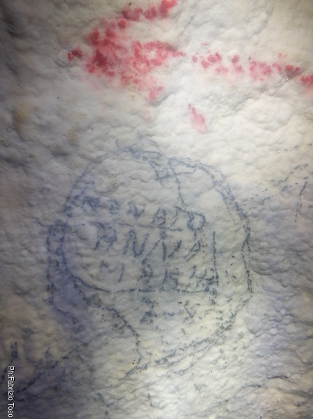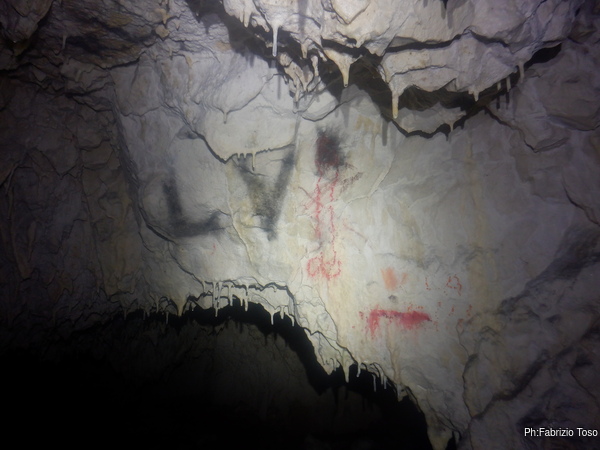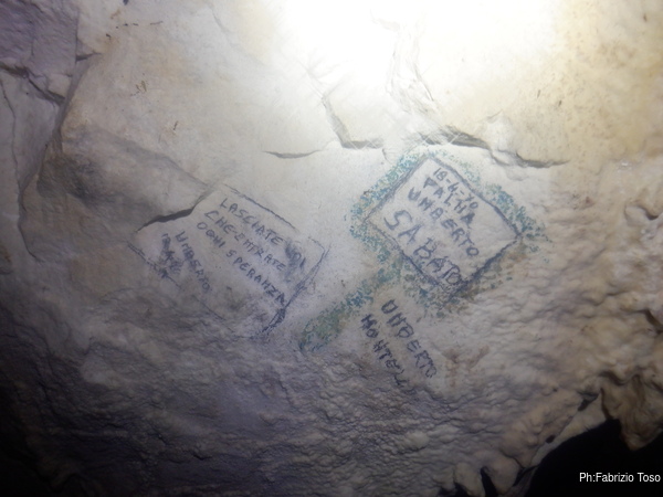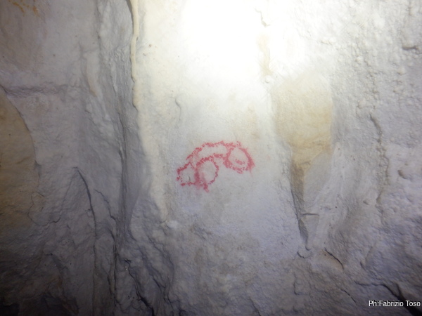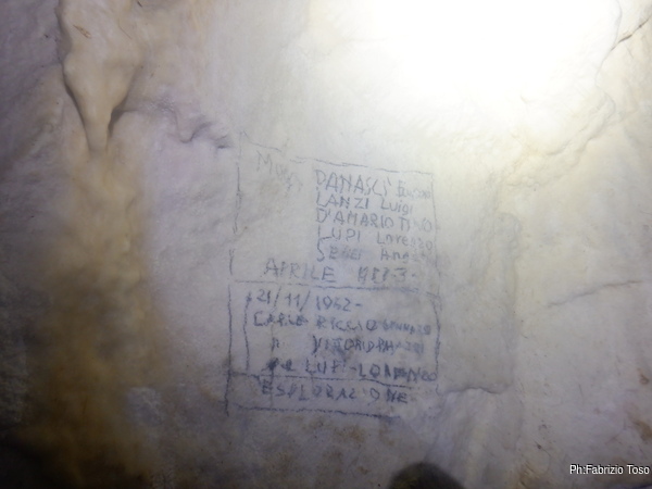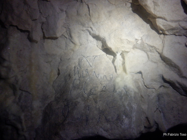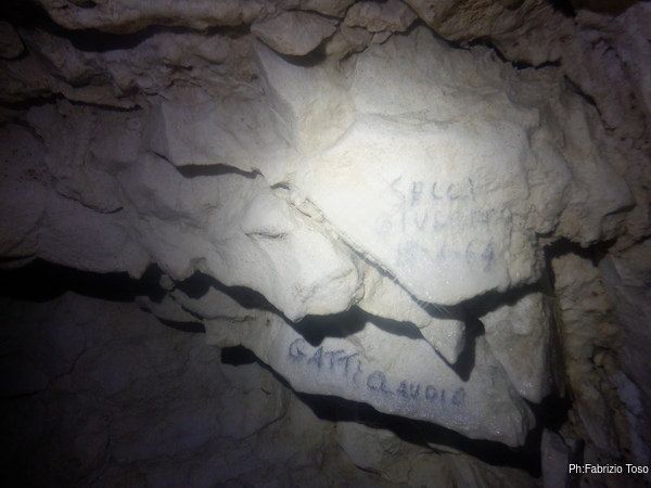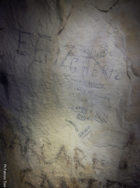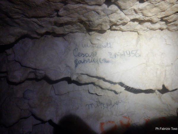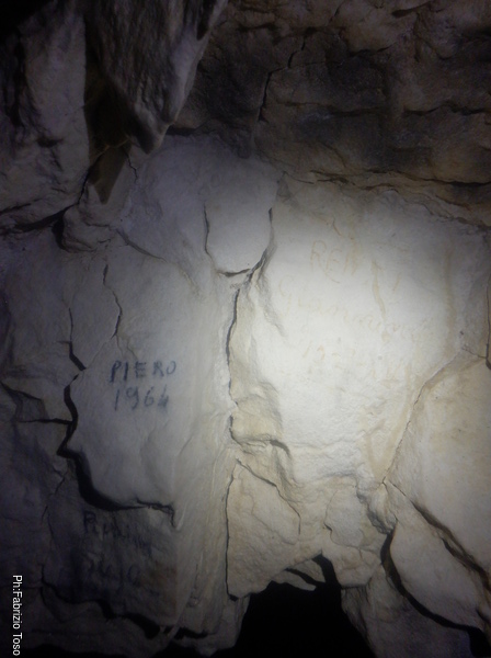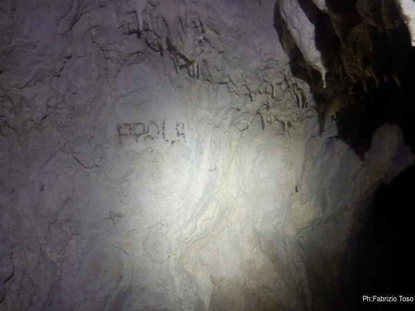 Quando arriva Gabriele, Alice si ferma con lui a parlare di tutto un po’. Non sono interessatissimo ma sono invece molto curioso di questa grotta quindi, dopo aver tentato di distogliere i miei amici dalla contemplazione di non so cosa, riprendo a vagare per la grotta. Incontro una scritta, Paola ha voluto lasciare traccia di se.