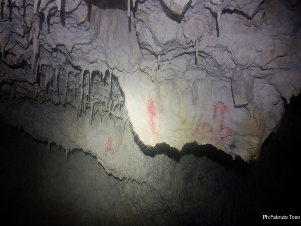 Andiamo avanti per circa tre ore alternandoci spesso. Alessandro ci racconta che, da notizie raccolte in paese, questa un tempo era una grotta visitabile ma e’ stata chiusa dai pastori per evitare che ci cadessero dentro le bestie al pascolo.