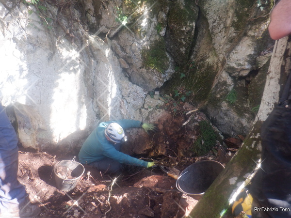 Dopo un buon quarto d’ora arrivano anche gli altri miei amici. Ci annunciano di aver trovato un altro pozzo. Alessandro spegne le loro speranze dicendo di averlo sceso e che chiude inesorabilmente dopo nemmeno quattro metri. Alice inizia subito a dare una mano ad Alessandro, Gabriele si siede vicino a Maria e la intrattiene parlando un po’ di tutto. Dopo un po’ Alessandro e Alice si spostano dove sto scavando io, cosi’ possiamo concentrare gli sforzi in un solo punto. Alternandoci a spostare sassi e terra il lavoro procede, lento ma procede. L’aria fredda sembra aumentare.