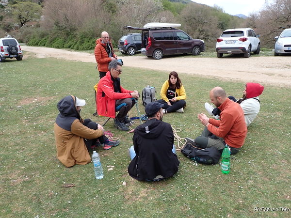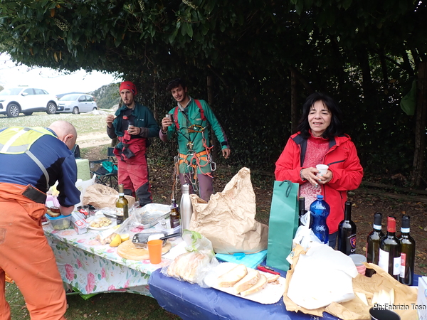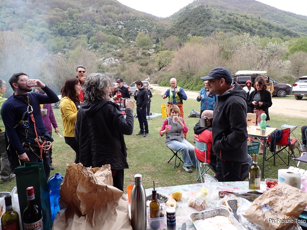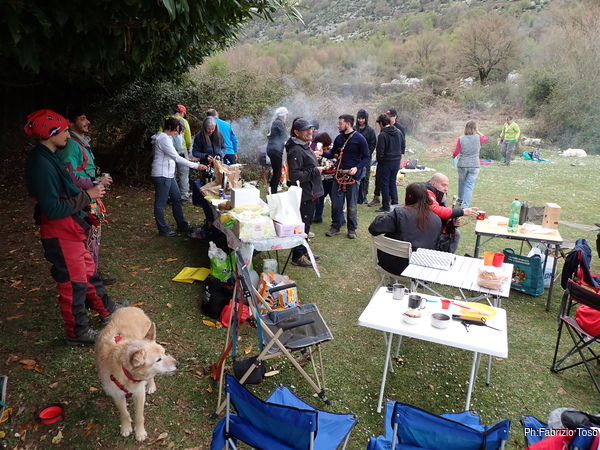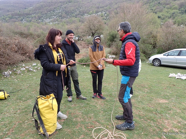 Quando il gruppo armatorio scompare nelle viscere della terra il folto gruppo di curiosi, di cui faccio parte, ritorna al campo base dove Stefano ha fatto proseliti e distribuisce sapienza “nodatoria” a piene mani.