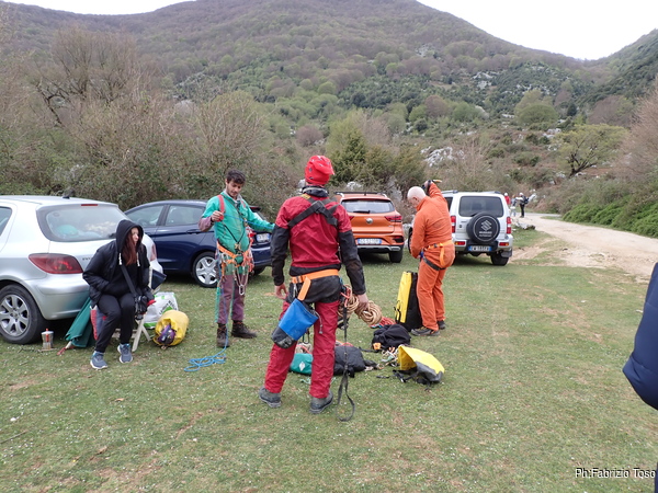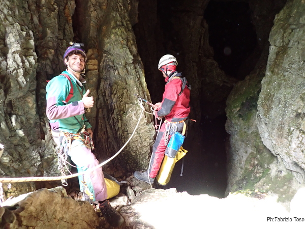 Dopo aver approntato la partenza sul masso d’ingresso procedono con l’armo del primo saltino.
