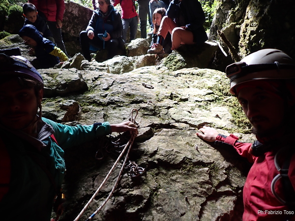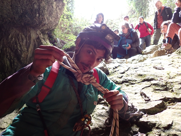Mentre i nostri due prodi armatori proseguono il lavoro Max improvvisa una calata per far provare l’emozione di una discesa in grotta ai due bei pargoli di Arelis. Io giustamente mi impiccio per dare fastidio nel tentativo di dare una mano.