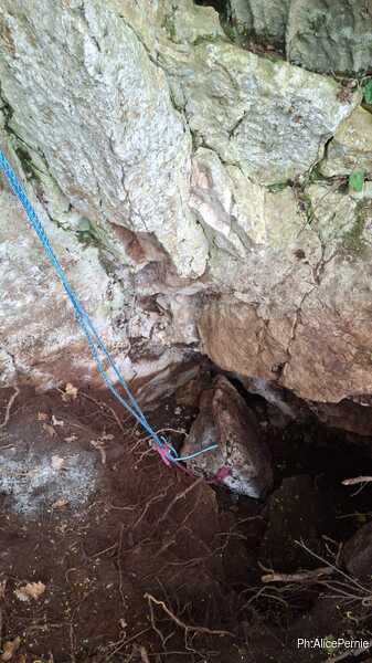 Alla fine rimedio un anello che fisso al sasso e una placchetta “da butto” vecchia come me che sistemo sulla parete. Come corda ho portato un “schifezzetta” da carpenteria da circa 6mm, la metto doppia e da un lato ci faccio un cappio per issarmici sopra e fare un rudimentale contrappeso.