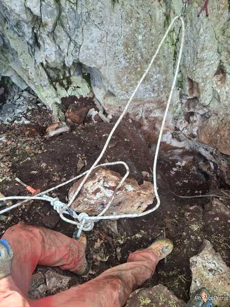 Recupero il multifix dal sasso e poi gli metto sotto dei sassi per puntellarlo meglio. Ora il passaggio di trasformazione del sasso da impiccio a comodo sedile e’ completo.