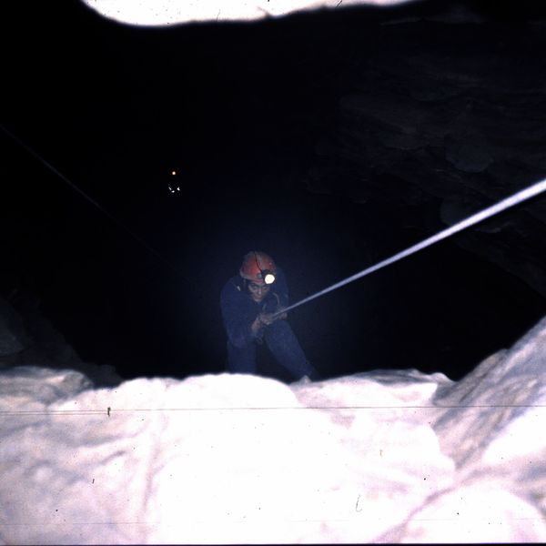 La discesa di un bel pozzo, a giudicare le lucine minuscole in basso.
