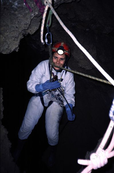 Federica che sorride iniziando la discesa di un pozzo.