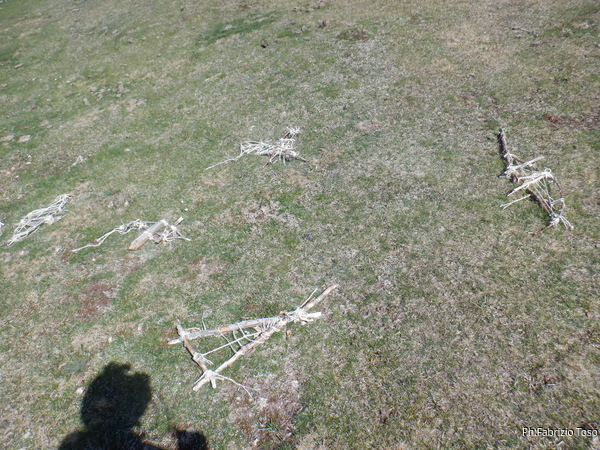 Invece qualche gitante si e’ esercitato a costruire manufatti con rami e corda per poi abbandonare tutto sul prato. Luca che ha esperienza afferma che si tratta di scout che probabilmente avevano dei capi-squadra (o come si chiamano in gergo scoutesco) poco attenti a lasciare il luogo visitato come lo avevano trovato. Comunque i manufatti sono graziosi, una via di mezzo delle ciaspole e dei acchiappasogni. Li lasciamo dove sono, magari piaceranno a qualche bimbo in gita.