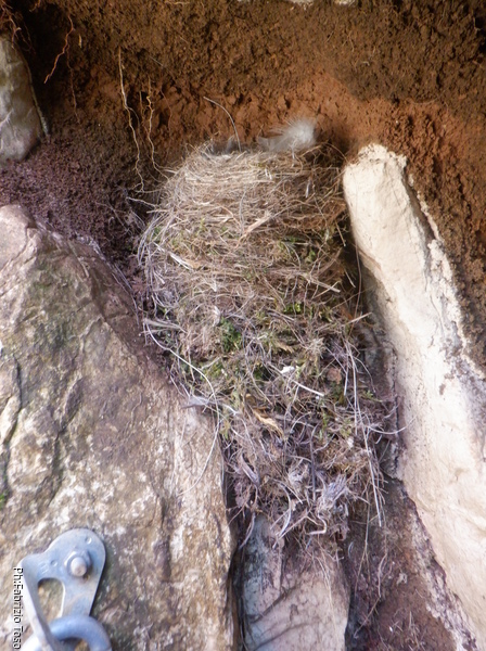 Per prima cosa entro nel recinto che dovrebbe proteggere la grotta per togliere i numerosi sassi che sono incastrati nella rete poi finalmente tiro da parte la rete per il nostro passaggio. Per mettere la corda non possiamo utilizzare il fix perche’ non abbiamo portato dadi di scorta. Luca trova un attacco naturale abbastanza solido e utilizziamo quello. Il secondo fix per fortuna non ha subito atti di incurante vandalismo. Monto il discensore e scendo. Luca poco prima aveva visto un uccellino volare via dall’ingresso della grotta, gli avevo sorriso con scetticismo. Ora vedo che aveva ragione lui, accanto al frazionamento c’e’ un nido! Non mi ci avvicino per guardare se ci sono uova, non vorrei creare involontariamente danni. Appena sistemato il primo frazionamento interno, un metro sotto la quota d’ingresso, mi metto comodo per far scendere Luca cosi’ che possa sottrarsi anche lui al caldo sole, infatti qua gia’ si sta al fresco.