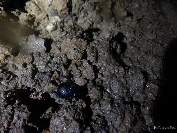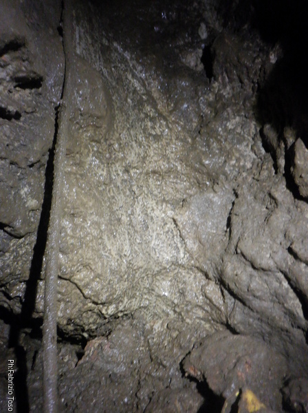 Scendo e termino di sistemare la corda. Dopo l’ultimo frazionamento manca da affrontare “solo” lo scivolo di fango. Mi stendo con rassegnazione nella melma e scendo nella prima saletta. Urlo la libera a Luca e attendo il suo arrivo. Nell’attesa inizio a togliermi parte dell’attrezzatura per non infangarla troppo e poi mi dedico a fotografare un “bacherozzo” che traffica nella melma.