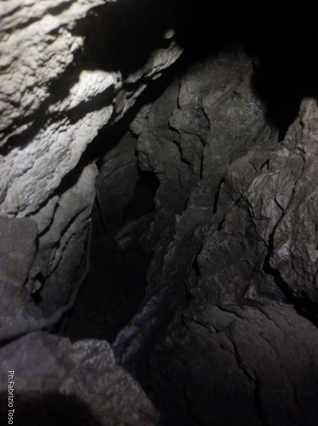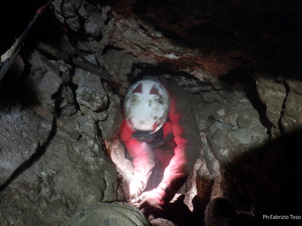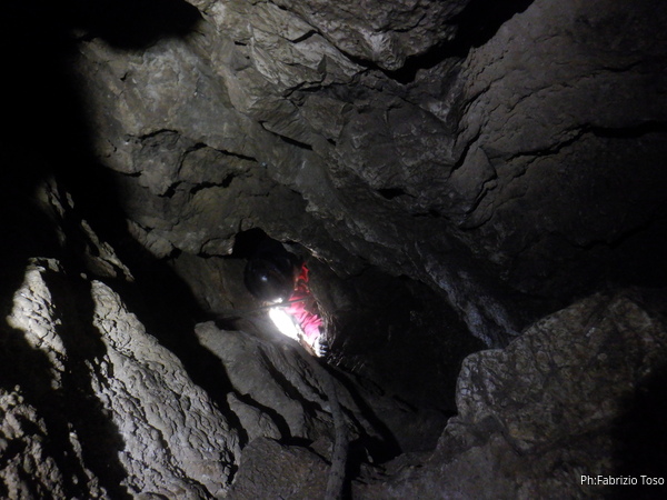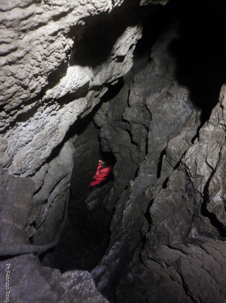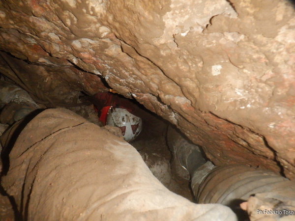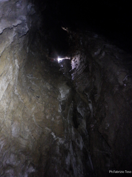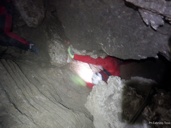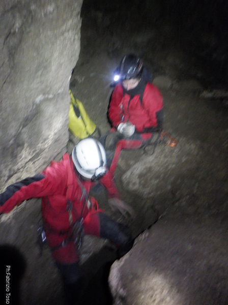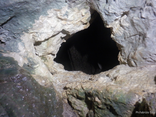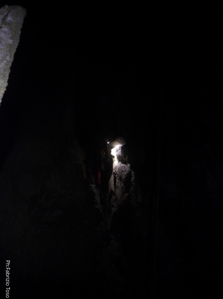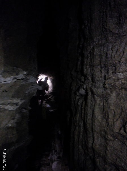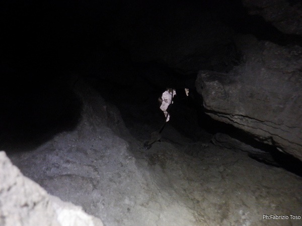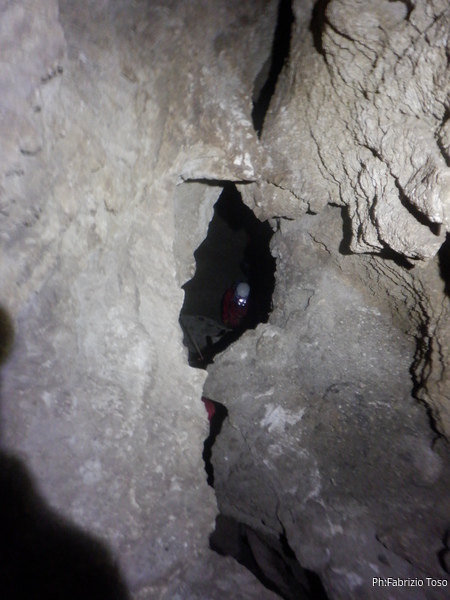 Continuando a girare in senso antiorario lungo le pareti incontro un passaggio alto in cui Angelo sta cercando di arrivare in arrampicata, vado oltre. Arrivo al buco successivo appena in tempo per vedere Alessio che vi scompare dentro. Incuriosito gli chiedo se continua e lui, quasi scomparso alla vista, mi risponde di si.