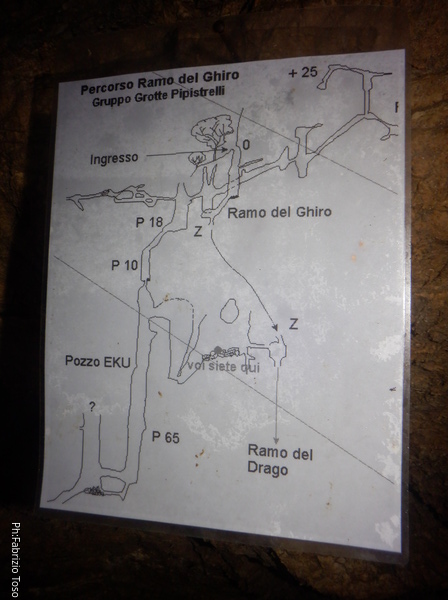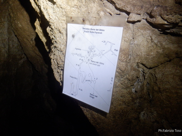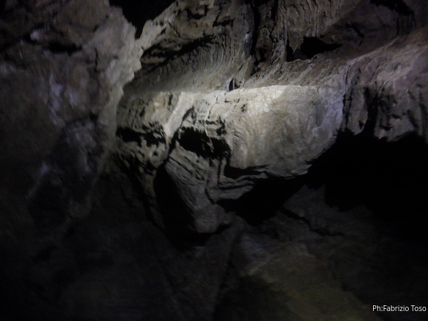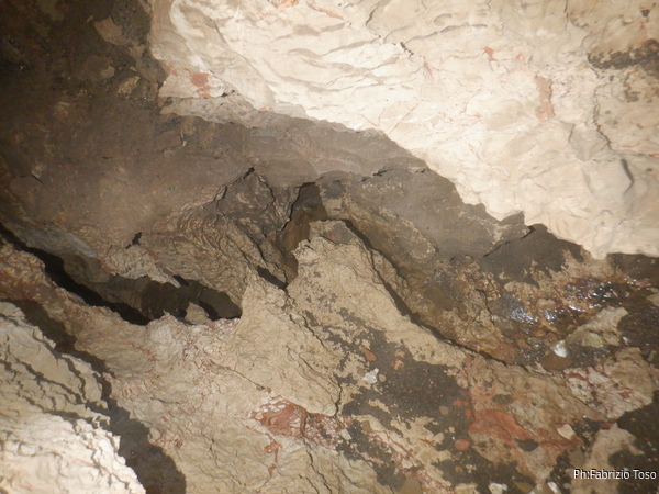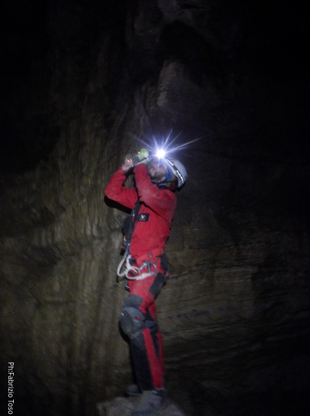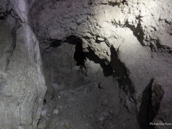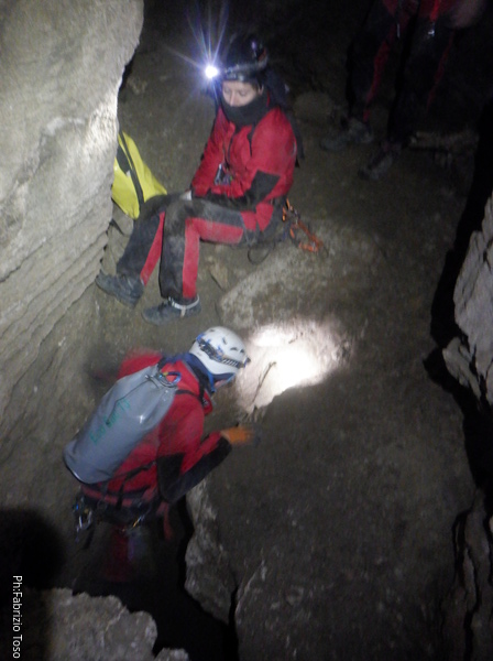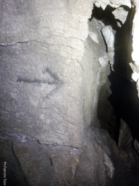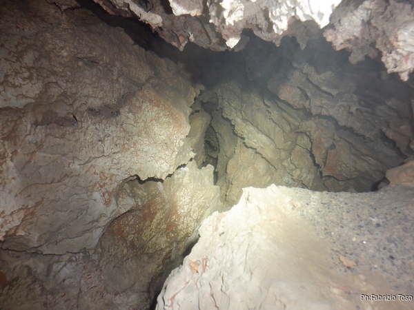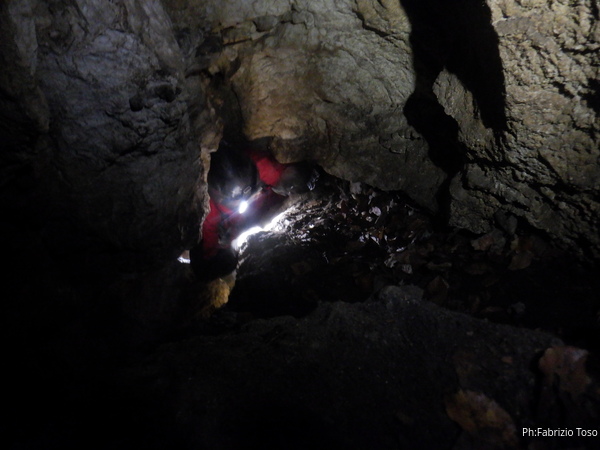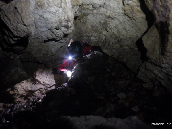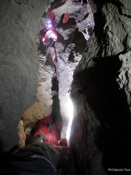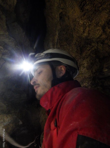 Continuando a girare in senso antiorario lungo le pareti incontro un passaggio alto in cui Angelo sta cercando di arrivare in arrampicata, vado oltre. Arrivo al buco successivo appena in tempo per vedere Alessio che vi scompare dentro. Incuriosito gli chiedo se continua e lui, quasi scomparso alla vista, mi risponde di si.