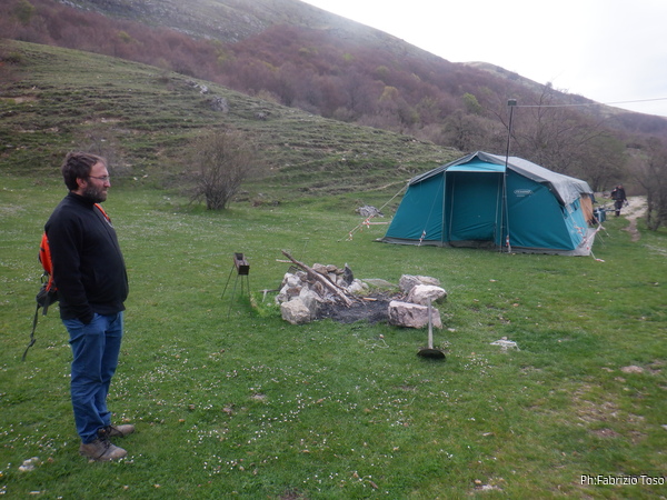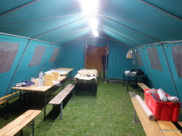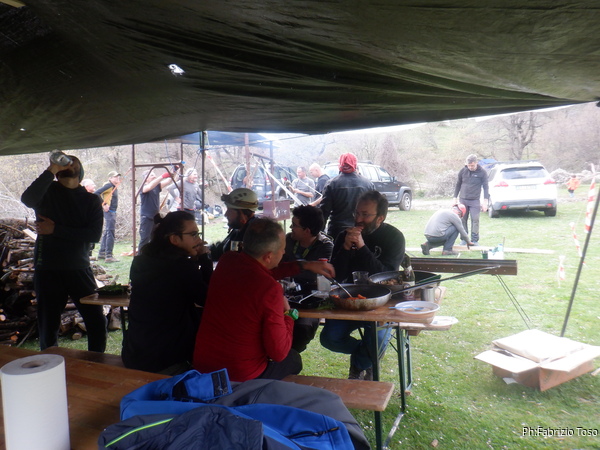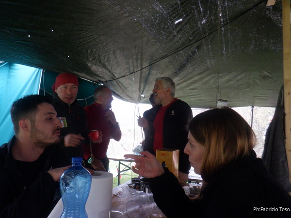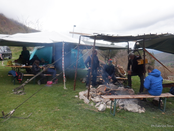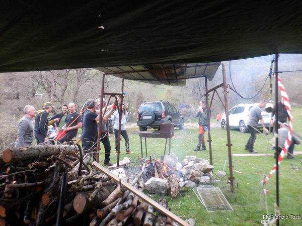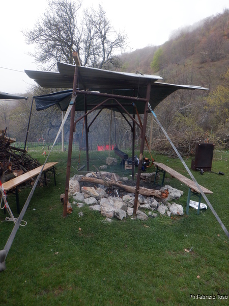 Appena fuori dal tendone alcuni valorosi stanno attrezzando la copertura per il fuoco dove verra’ cotta la carne alla brace. Con piacere vedo anche il “coso” per cuocere gli arrosticini, il mio stomaco brontola di approvazione.