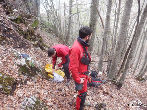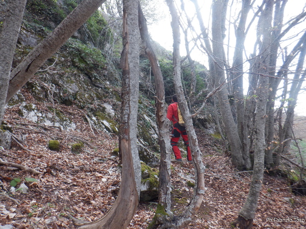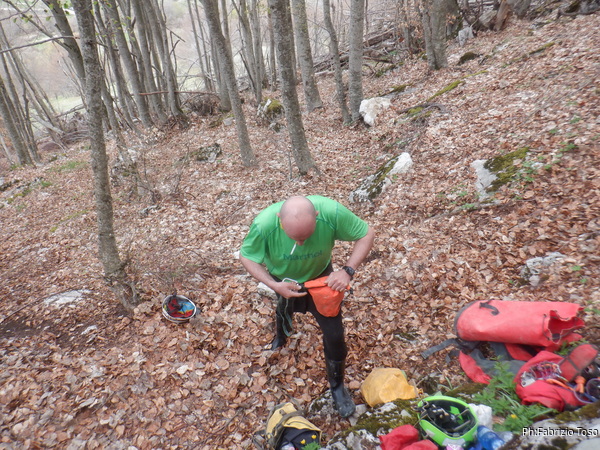 Gabriele oramai e’ scatenato e parte nel bosco alla ricerca di 2 grotte di cui abbiamo solo delle coordinate poco precise. Si tratta di POZZO DELL’ALBERO (LA1563) e di POZZO VESTIRE GLI IGNUDI (LA885). Li cerchiamo con passione ma non li troviamo.