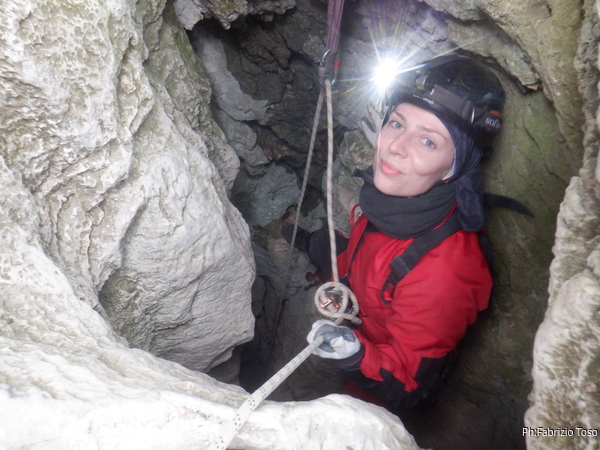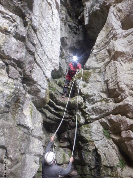 Successivamente dobbiamo passare il saltino di 5 metri, quello piu’ lungo della grotta. Federico scende per primo poi insieme facciamo assistenza a Diana. Paola lasciamo che se la cavi da sola, tanto e’ brava.