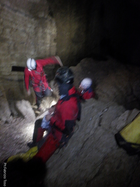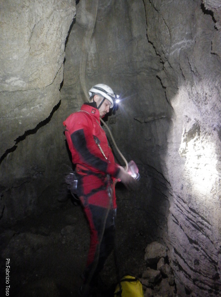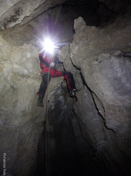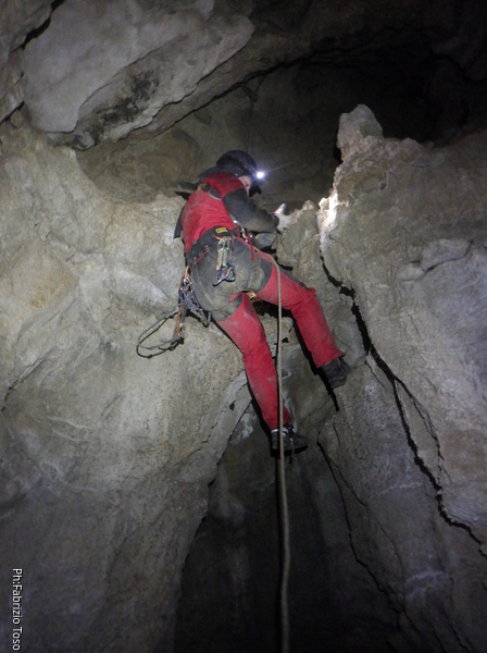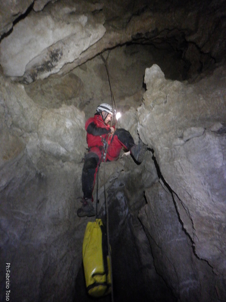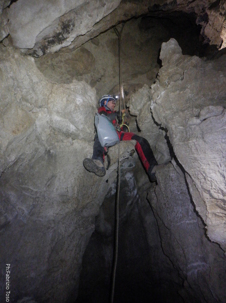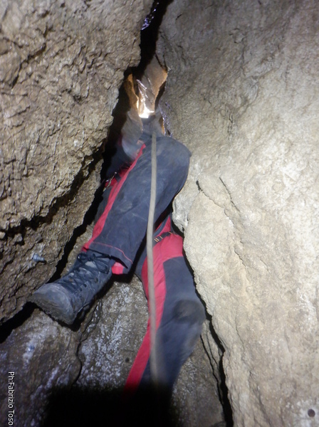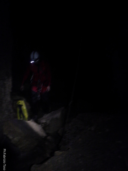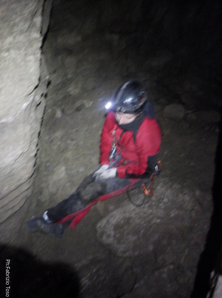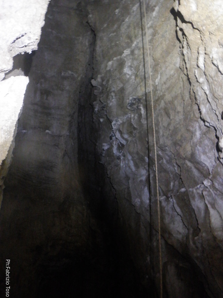 Torniamo al “campo base”, Luca torna alla prima saletta per mettersi l’attrezzatura, passando scioglie la corda di servizio e io la recupero. Mentre aspetto che torni striscio di nuovo nel cunicolo portando con me la corda. Cerco un armo naturale poiche’ non abbiamo ne’ fix ne’ trapano. Bene, poco piu’ avanti c’e’ uno spuntone di roccia che fa al caso nostro. Faccio un nodo alla corda e la incastro nello spuntone di roccia. Con la mazzetta stacco un bel pezzo di roccia che incastro per fare in maniera che la corda non possa uscire dalla sede che le ho imposto. Appena fatto faccio un bel nodo in fondo alla corda e la butto giu’.