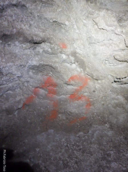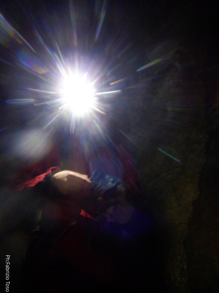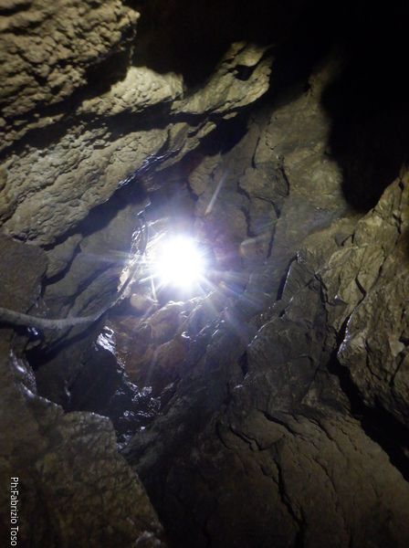 La salita per uscire e’ meno agevole dell’andata. In un punto particolarmente stretto riesco a dare una sonora botta al casco, sul davanti. Sento un rumore strano ma lo attribuisco alla roccia che mi circonda. Avanzo ancora un poco districandomi dallo stretto. Al passo successivo vado ad appoggiare la mano in prossimita’ di un appiglio quando noto un frammento di vetro che brilla illuminato dal mio led. Lo scanso pensando che e’ proprio una cosa curiosa trovare un minuscolo vetro in grotta.