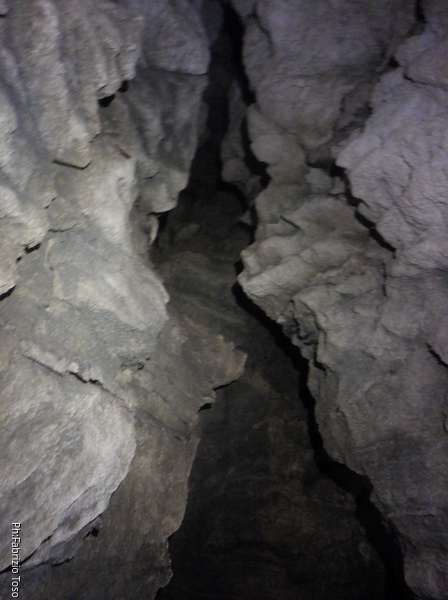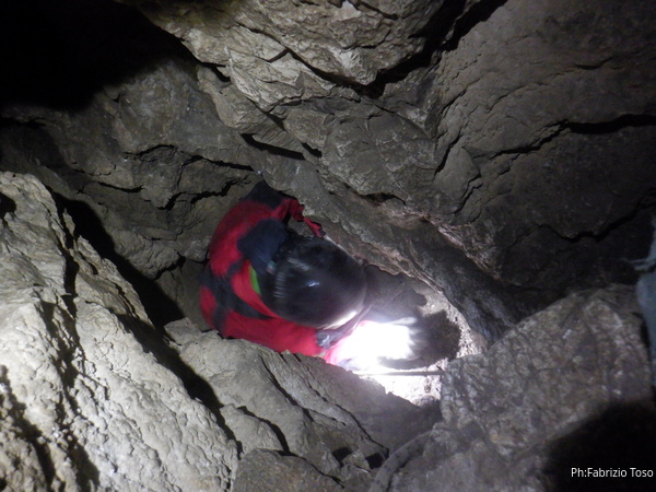 Visto che si tratta di un saltino da nulla decido di provare anche io a passare. Nulla da fare, dopo qualche centimetro di speranza mi incastro inesorabilmente col bacino compresso tra le pareti di roccia. Non mi resta altro che rassegnarmi e passare la fotocamera a Luca perche’ documenti la nostra scoperta.