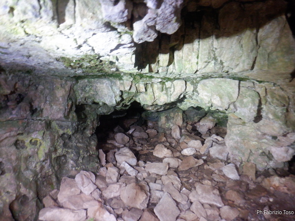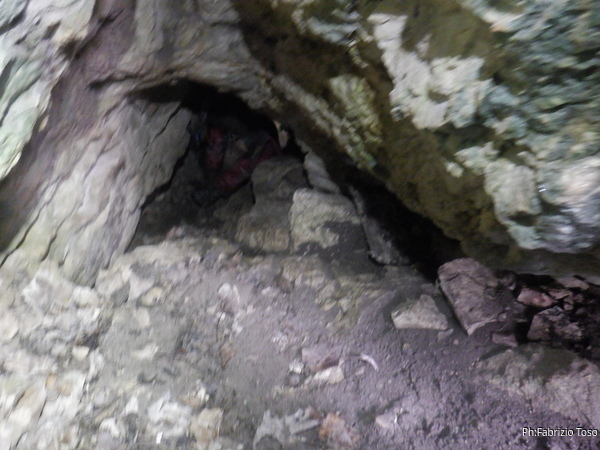 Sulla destra c’e’ un bel buco, chiaramente scavato da qualche speleo e dentro si puo’ vedere un ampio ambiente. Uno dei nostri accompagnatori mi dice che oltre all’ambiente che ho visto hanno trovato nulla. Visto che per scendere probabilmente servirebbe una corda mi rassegno a lasciarlo perdere.