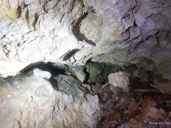 Tiro fuori la luce dallo zaino per dare uno sguardo dentro. Anche se sono sicuro che la grotta e’ in catasto a vederla ora non sembra proprio granche’. L’unica nota positiva e’ data da un leggero soffio d’aria che avverto sulla mano.