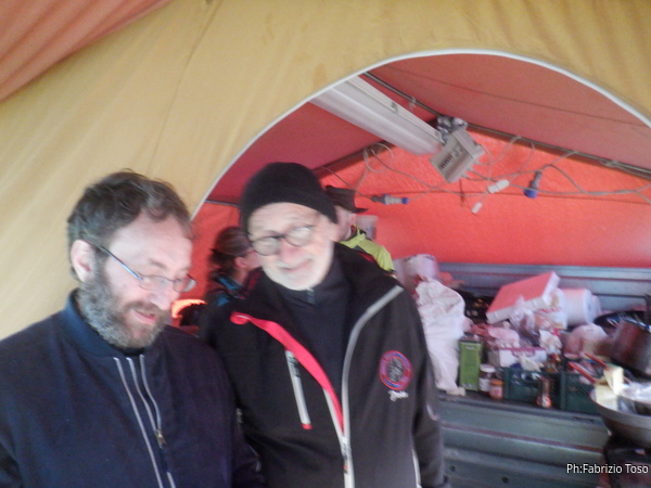 Visto il freddo sofferto la notte precedente stavolta vado in tenda con un supplemento di copertura e devo dire che dormo molto meglio, complice forse anche il vino e la stanchezza. Naturalmente alle 6.30 sono in piedi e dopo aver sbrigato le mie faccende mattutine mi dedico al laborioso smontaggio della tenda. La mia tenda e’ una di quelle malefiche che chiamano 2″ (due secondi). In pratica ci metti si 2 secondi ad aprirla ma poi mediamente un 2 ore per chiuderla, una vera dannazione! Oggi pero’ affronto il cimento con cuore leggero, qua vicino c’e’ Angelo che e’ esperto di queste tende e so che in caso di disperazione posso chiedere aiuto.