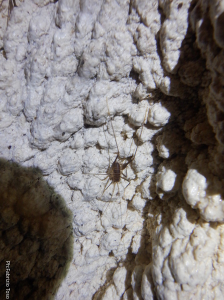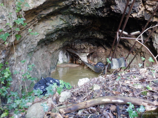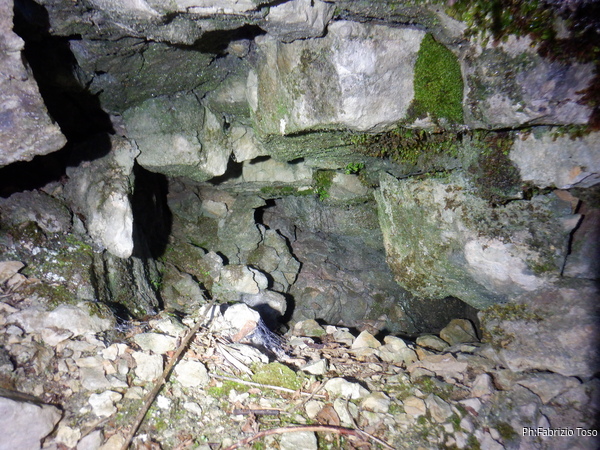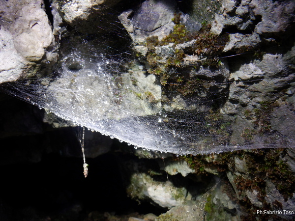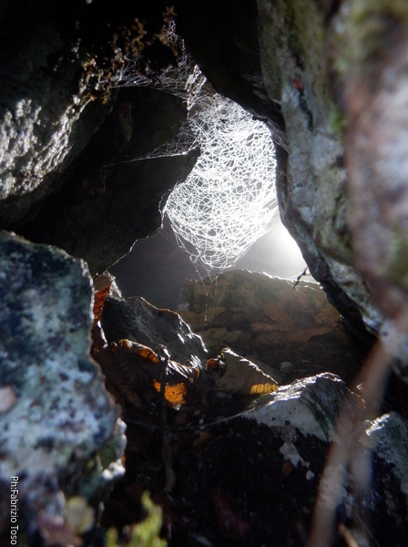 Alla fine del reportage recupero la fotocamera per fare una foto da un piccolo pertugio laterale all’ingresso mentre Gabriele da dentro illumina una complessa ragnatela.