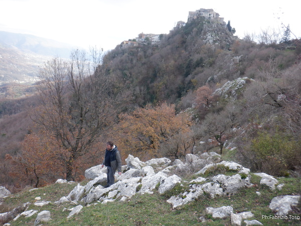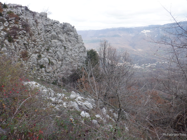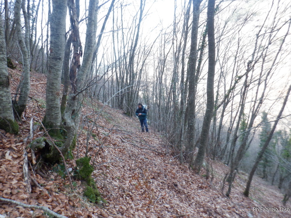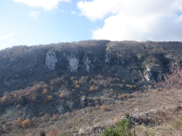 In verita’ Gabriele prova a dire: “seguiamo il sentiero basso che sale meno velocemente”, pero’ non lo dice con troppa convinzione, quindi lo costringo a proseguire per la via diretta. Luna nel frattempo scorrazza con gioia facendo la spola tra Gabriele e me. Dopo una salita abbastanza ardua finalmente arrivo a ridosso della parete che e’ la nostra meta, i “cofacchi”, appunto.