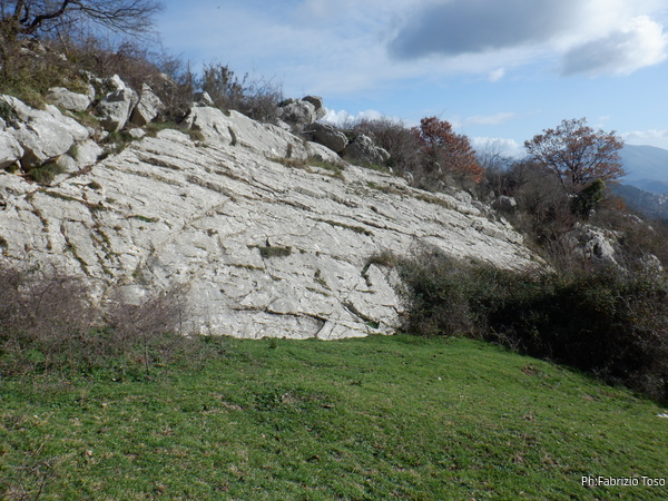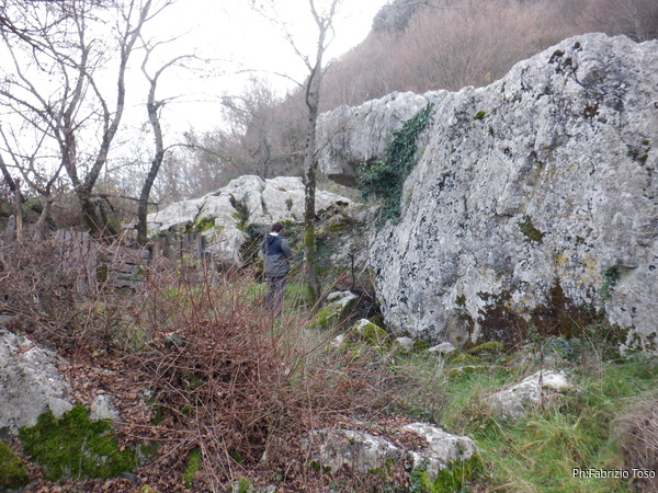 Contenti e soddisfatti per questo primo successo riprendiamo le nostre cose e torniamo a camminare lungo la parete, stavolta verso sinistra. Finalmente ritroviamo il famoso sgrottamento “dei cofacchi” che per noi da’ il nome a tutta la zona. Una foto e’ doverosa.