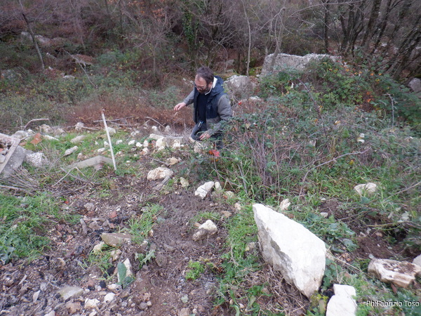 Stiamo cercando un buco che trovammo la volta scorsa. Sembrava interessante perche’ soffiava. Purtroppo il punto lo avevo preso io e non l’ho piu’ quindi dobbiamo cercarlo di nuovo.