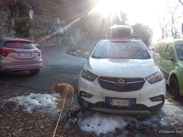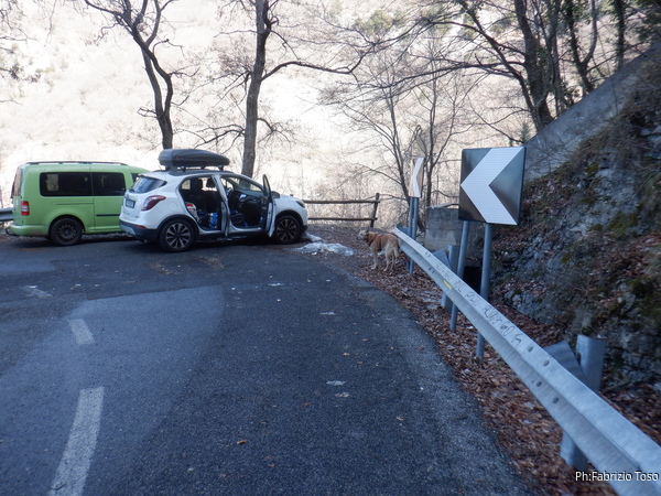 Quando Luna ha sentito parlare di passeggiata nei boschi ha assolutamente voluto venire anche lei quindi la mattina Gabriele passa a prenderci e insieme andiamo prima a fare colazione, poi passiamo al magazzino a prendere il materiale poi saliamo prendendo la strada per Livata fino a circa meta’ dove parcheggiamo in corrispondenza di un tornante. Stavolta troviamo anche un’altra macchina, forse di arrampicatori. Ci accostiamo e iniziamo a prepararci.