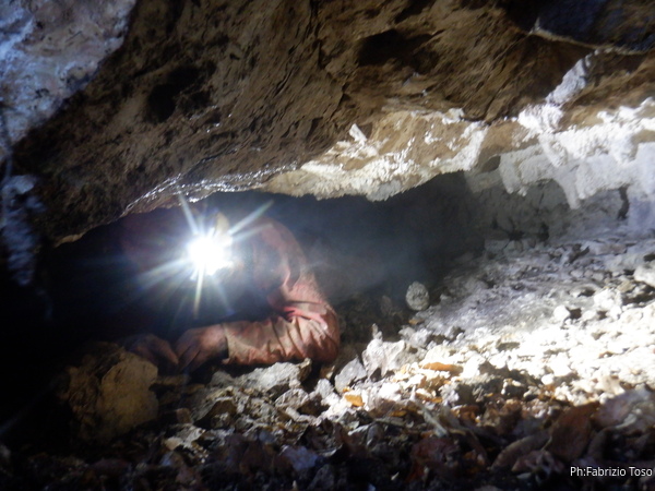 Mi infilo a dare una sbirciatina, avanza “comoda” per circa 3 metri poi il soffitto si abbassa troppo. Si intravede qualcosa ma e’ meglio andare a controllare da vicino.