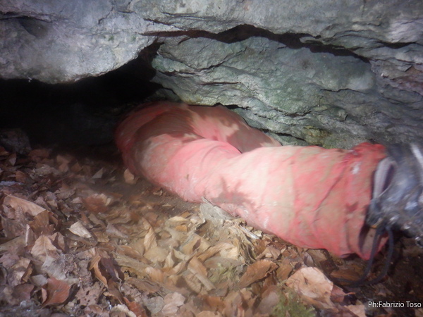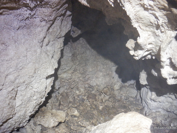 Gli passo la fotocamera per documentare. Si tratta di una galleria alta non piu’ di 50 centimetri che corre parallela alla parete esterna. Guardandola dall’ingresso si vede sulla sinistra un ambiente largo circa 2 metri e lungo almeno 4 che termina con quella che Gabriele col suo consueto ottimismo definisce “saletta”. Se ci sono prosecuzioni non sono evidenti. Dall’altro lato, sulla destra la galleria prosegue per 3 metri anche qua senza prosecuzioni visibili.