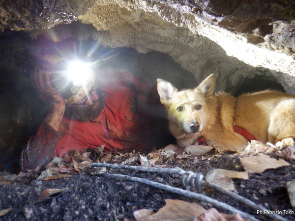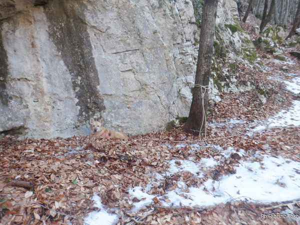 Gabriele si prepara per allargare l’ingresso e rendere la grotta ispezionabile. Io mi allontano un attimo per andare a vedere un altro buco quando mi sovviene che Luna potrebbe spaventarsi al rumore del trapano. Mi convinco che e’ meglio legarla prima che scappi. Non faccio a tempo! Proprio mentre chiamo Luna per assicurarla alla corda che ho portato per lei, Gabriele inizia ad usare il trapano. Vedo lo sguardo di Luna cambiare dallo spensierato all’impaurito. Si ferma a due passi da me poi si gira e inizia a scappare, sorda ai miei richiami. Gabriele assorto nel suo lavoro si e’ accorto di nulla, gli urlo di smettere un attimo perche’ devo riprendere Luna. Gia’ mi vedo dover scendere fino alla macchina per recuperare Luna, non so perche’ ma ha deciso che il suo luogo sicuro e’ quello e di solito la ritrovo la’ quando scappa per la paura. Pero’ per ora la vedo correre sul sentiero parallelo alla parete. Dopo circa un chilometro di richiami e disperazione la ritrovo che scorrazza di nuovo spensierata. Stavolta ascolta il mio richiamo e si avvicina. Quando finalmente la acchiappo per il pettorale la riporto quasi di peso verso il nostro campo base. Questa fatica mi procura un forte mal di schiena ma il sollievo per il pericolo scampato lo rende piu’ tollerabile. Per fortuna quando sono a un centinaio di metri Gabriele sente le mie urla e mi porta la corda con cui lego Luna. E’ una corda da 10 metri quindi avra’ possibilita’ di muoversi, ma per camminarci assieme su un sentiero costellato di rami non e’ la cosa piu’ semplice del mondo, ne’ per me, ne’ per lei. Nei pochi metri che dobbiamo ancora percorrere Luna riesce a legarsi in maniera incredibile e devo intervenire per slegarla. Ritornati alla base la lego, potra’ allontanarsi ma restando sempre a vista. Ad ogni modo e’ deciso, Luna e il trapano sono incompatibili, non ripeteremo esperienze di questo tipo, troppo stress per lei e per me.