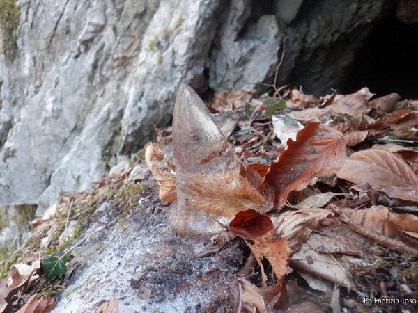 Cammina cammina il buco soffiante non lo ritroviamo piu’, in compenso trovo un’altra forse-grotta che ha l’ingresso una piccola stalagmite di ghiaccio.
