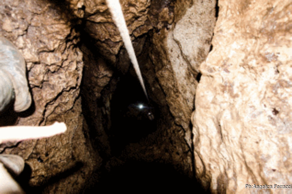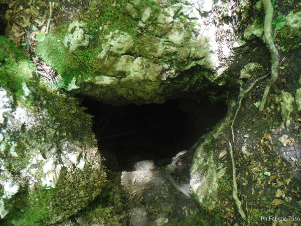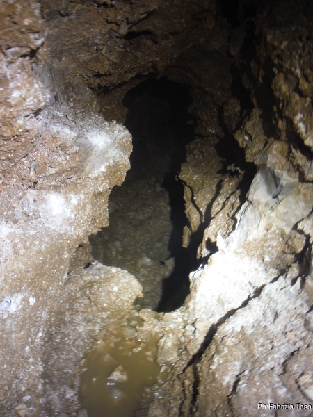 Ai margini della cava c’e’, guarda caso, la grotta della Cava. Gianluca me la indica e vado a dare uno sguardo. E’ interessante, dal buco esce una forte aria gelida. Dopo un rapido giro, pero’ la lascio, oggi abbiamo altri programmi.
