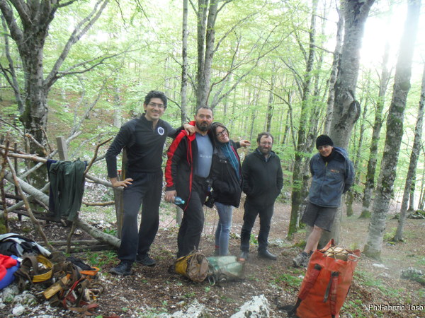 Tutta la nostra escursione si basa sul presupposto che la grotta sia gia’ armata per una festa del GSCAI Roma. Nulla di piu’ errato. Per fortuna, i nostri amici del GSCAI arrivano mentre ci stiamo preparando, proprio per completare l’armo della grotta. Dopo i saluti ed una foto in loro compagnia…