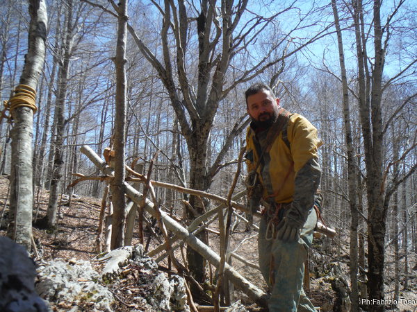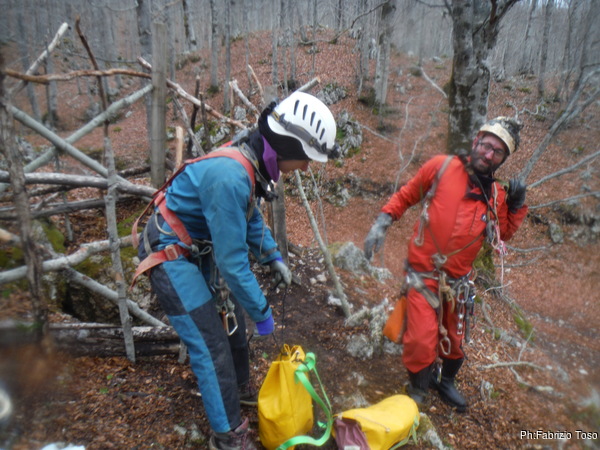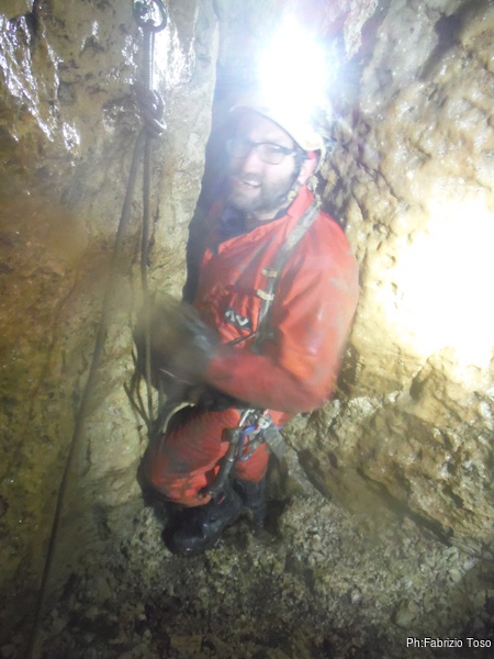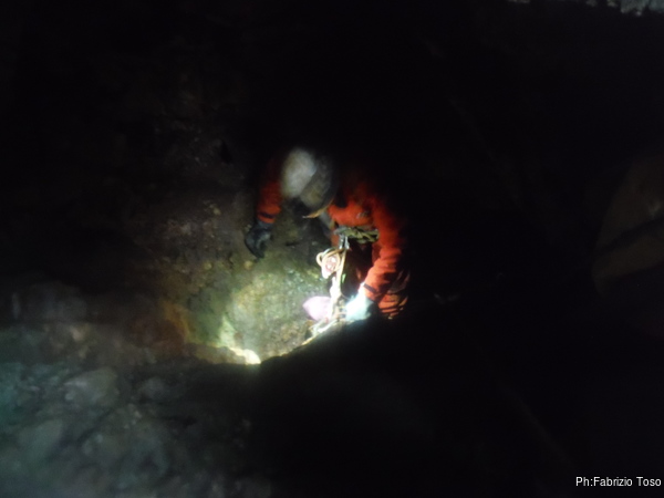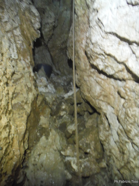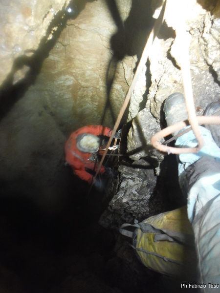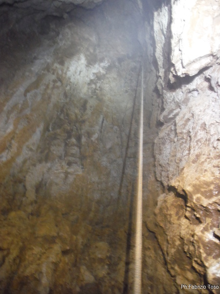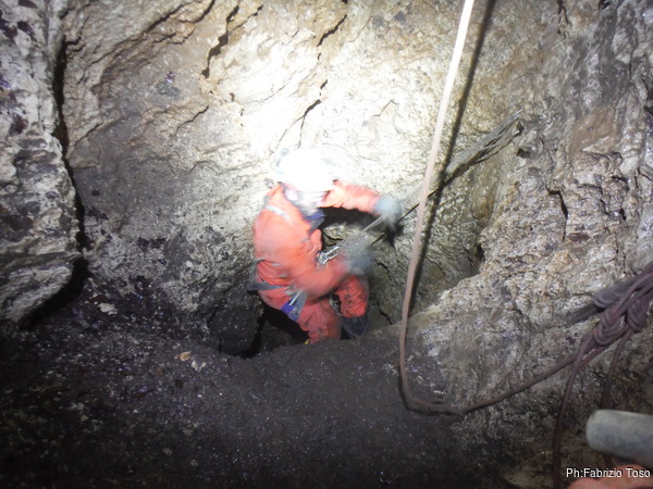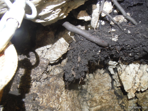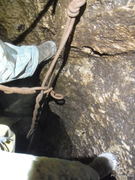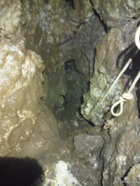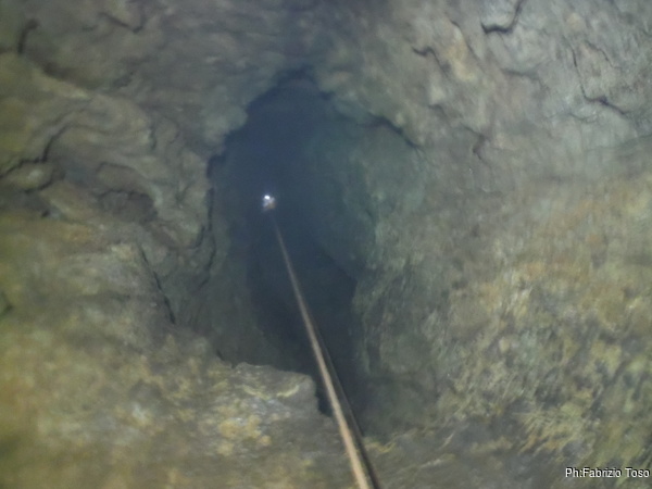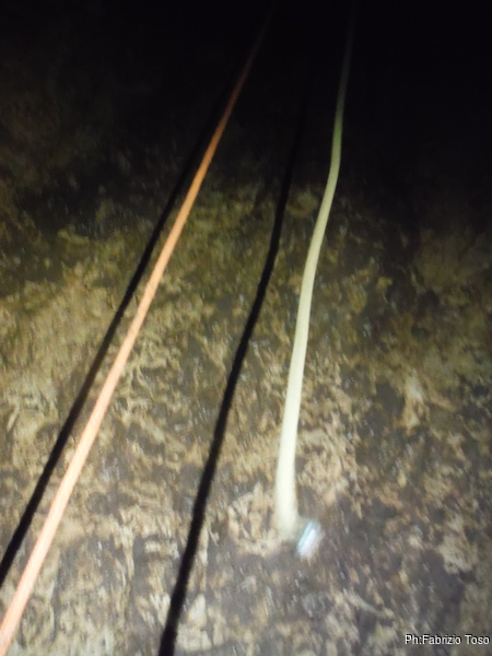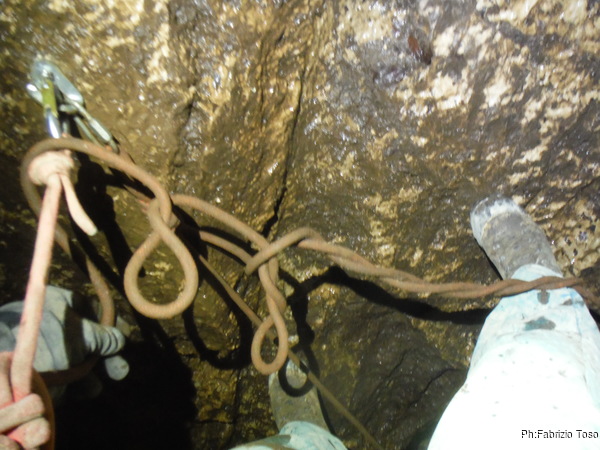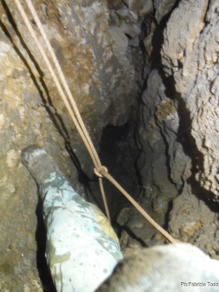 Facciamo il piano di massima per la giornata. Fabio e Valerio entreranno per primi ed andranno al fondo per proseguire i lavori. Io li seguiro’ dopo aver fatto il primo pozzo insieme al quartetto dei miei amici orvietici. Prima che Valerio parta mi raccomando con lui: “Prendi lo zappetto alla base del primo pozzo, ti sara’ utile per drenare l’acqua in fondo, dove lavorerete”. Mi fa un cenno di assenso e scompare velocemente giu’. In un paio di minuti anche Fabio parte.