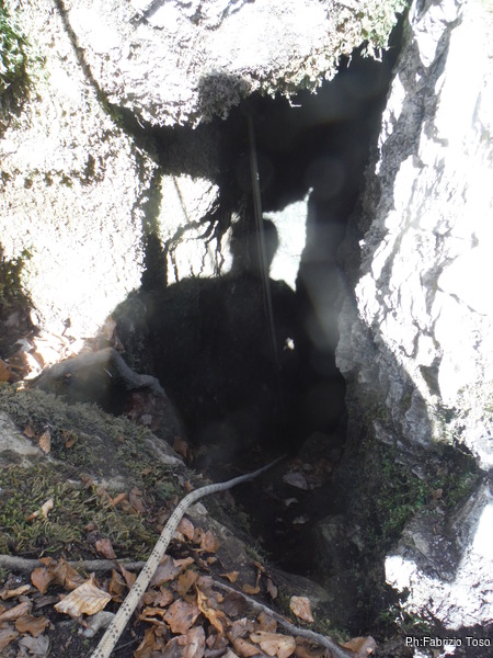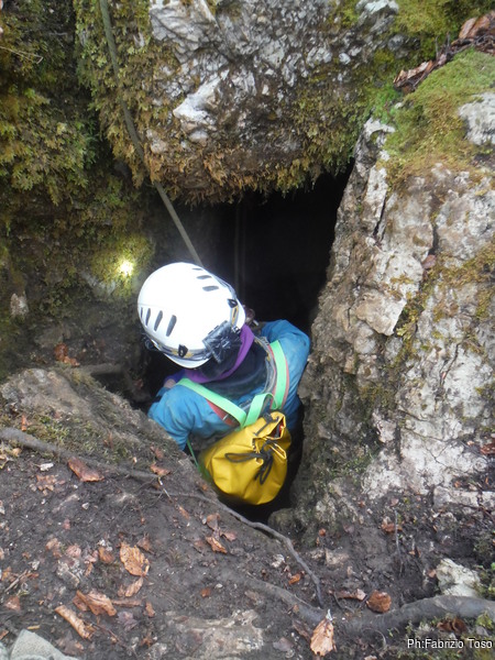 Mentre il resto del gruppo arriva in ordine sparso, mi occupo di spiegare loro qualcosa della grotta. Nel frattempo Valerio monta la corda per l’ingresso.