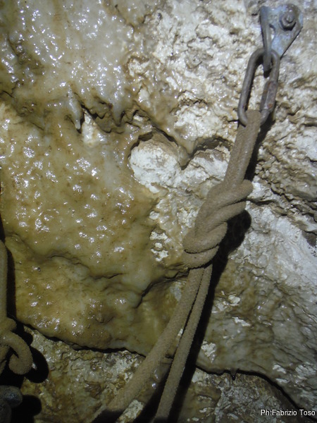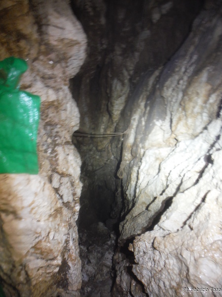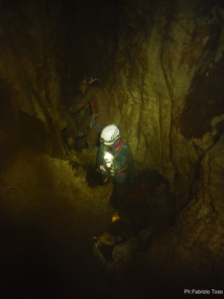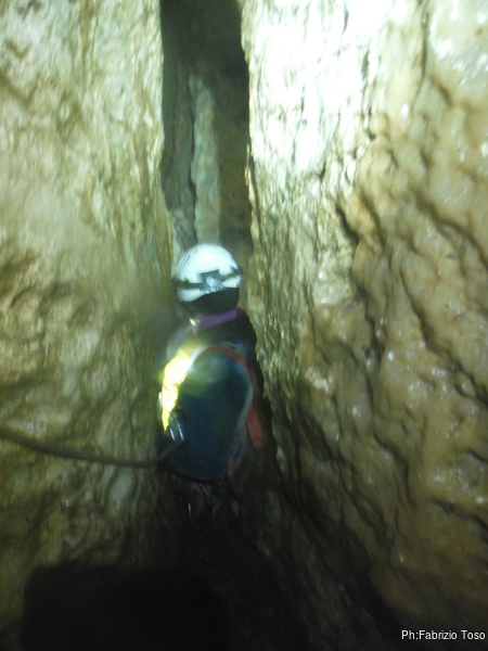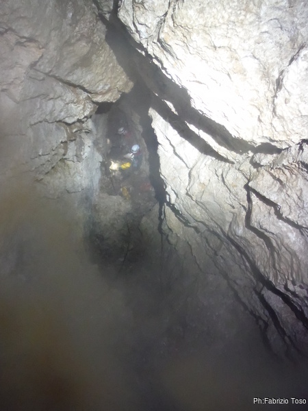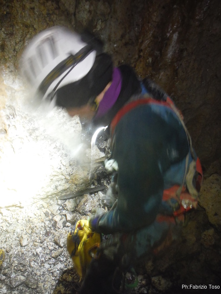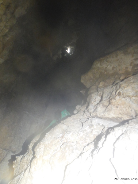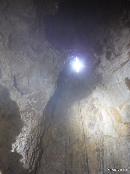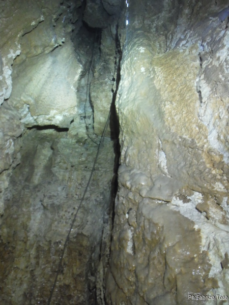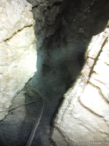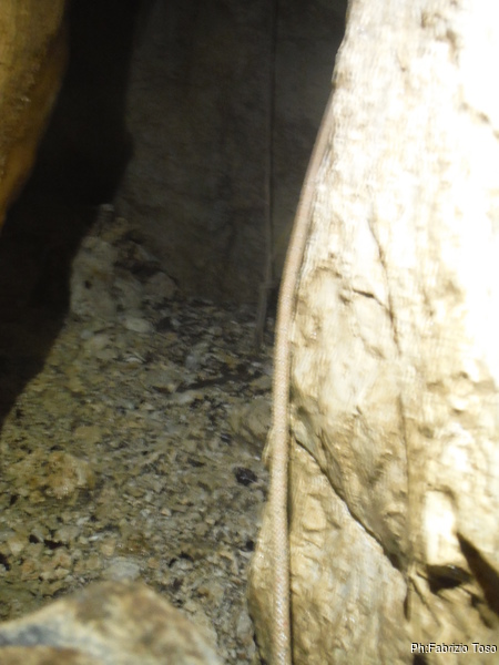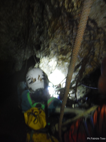 Passiamo un paio d’ore circa lavorando di buona lena, sempre nella stessa configurazione, Valerio avanti, Fabio in prima linea ed io nelle retrovie. I miei amici sopra sono arrivati in zona, la partenza dell’ultimo pozzo, da un po’, ne avverto i rumori. Ad un certo punto sento chiamare dall’alto. Salgo fino alla base del pozzo per sentire. E’ Simone, mi avverte che secondo loro la risalita e’ inutile farla, e non la faranno. Oltre a questo, Chiara ha iniziato a sentire mal di gola, tossisce e preferisce uscire. Simone la accompagnera’ fuori. Barbara e Giuseppe, lasciati soli ed inoperosi, decidono di scendere a farci visita. Aspetto che arrivino per far loro delle foto.