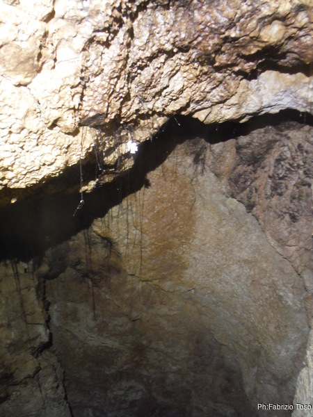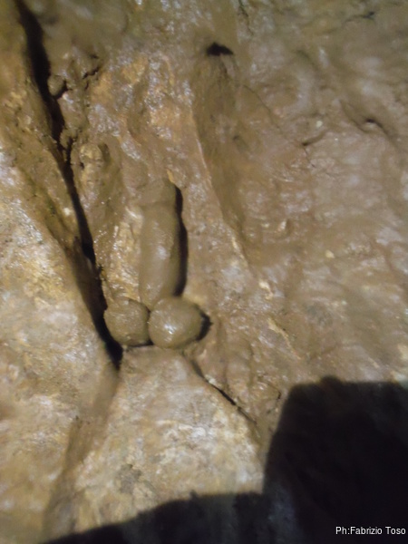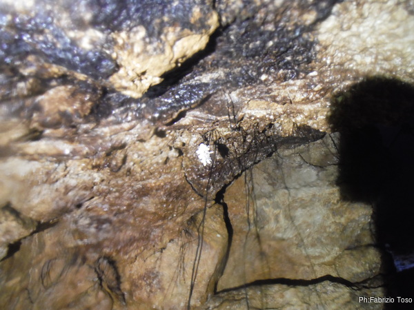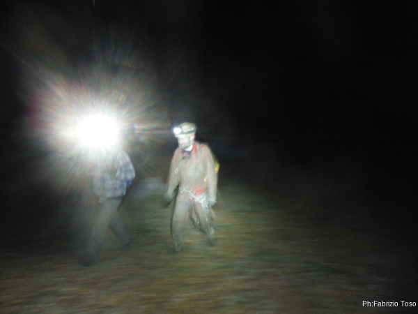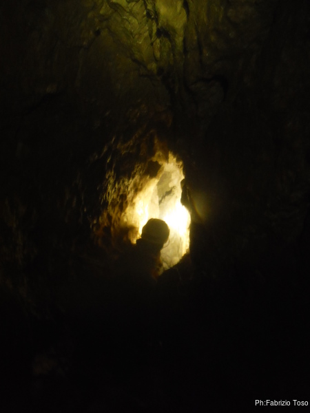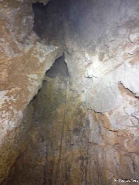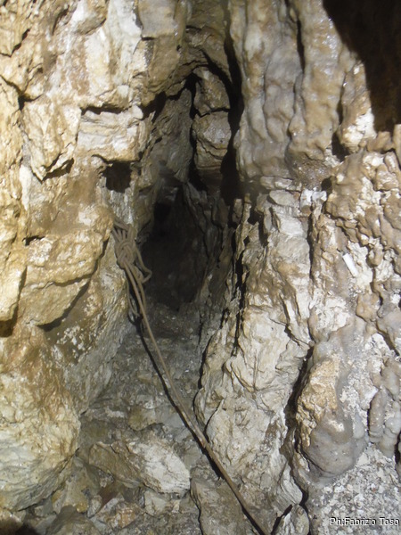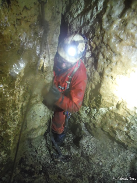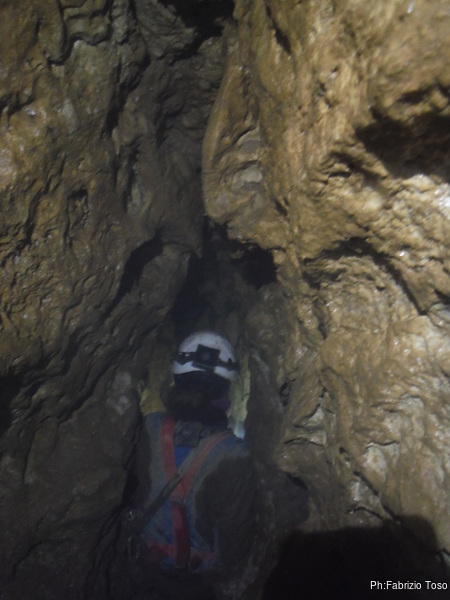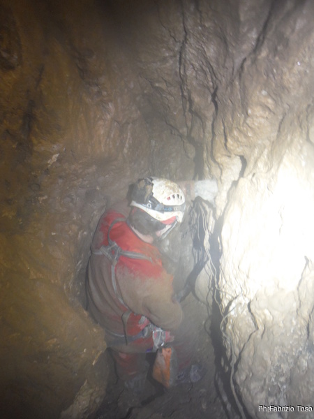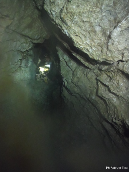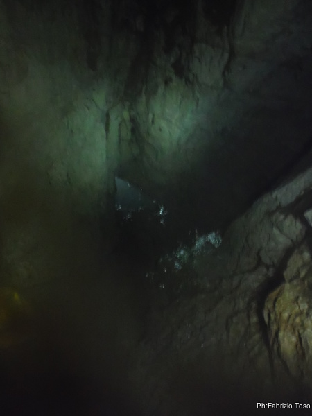 Passiamo un paio d’ore circa lavorando di buona lena, sempre nella stessa configurazione, Valerio avanti, Fabio in prima linea ed io nelle retrovie. I miei amici sopra sono arrivati in zona, la partenza dell’ultimo pozzo, da un po’, ne avverto i rumori. Ad un certo punto sento chiamare dall’alto. Salgo fino alla base del pozzo per sentire. E’ Simone, mi avverte che secondo loro la risalita e’ inutile farla, e non la faranno. Oltre a questo, Chiara ha iniziato a sentire mal di gola, tossisce e preferisce uscire. Simone la accompagnera’ fuori. Barbara e Giuseppe, lasciati soli ed inoperosi, decidono di scendere a farci visita. Aspetto che arrivino per far loro delle foto.