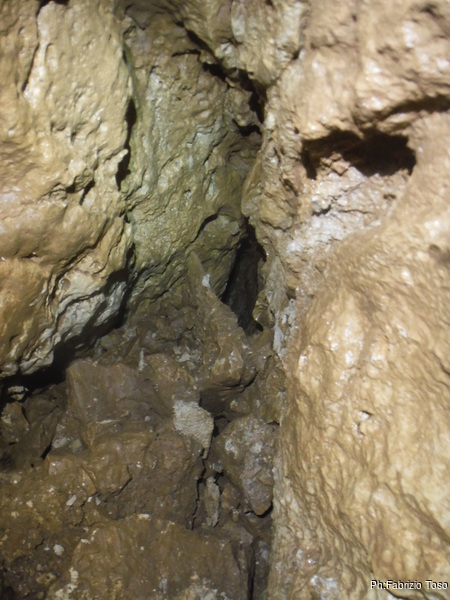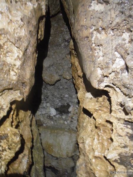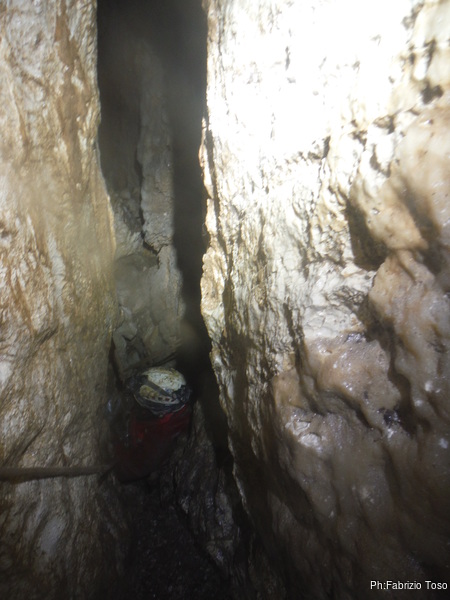 Gia’ quando arrivo in fondo al primo pozzo noto che oggi lo stillicidio e’ particolarmente intenso, molto piu’ delle altre volte. Come mi aspettavo, lo zappetto giace ancora placidamente la’. Con un sospiro lo prendo e lo infilo nello zaino. Per buona misura alla partenza dell’ultimo pozzo prendo con me anche una cofana, magari servisse per togliere altro fango. Giu’ al fondo lo stillicidio e’ ancora molto forte ma per fortuna la zona lavori ne e’ abbastanza immune. Mi levo l’attrezzatura poi vado a curiosare. Come mi aspettavo sono nel pieno del lavoro. Di acqua alla base della strettoia ce n’e’ in abbondanza, li avverto che ho portato lo zappetto ma ora sono troppo impegnati nello scavo per pensare a tenere i piedi all’asciutto. Mi dispongo dietro a Fabio cercando di dare una mano. La situazione e’ questa, Valerio e’ nella strettoia pigiato come un’acciuga e con i piedi immersi nell’acqua, Fabio passa gli strumenti che mano mano servono, anche lui ogni tanto lancia dei moccoli quando deve poggiare il ginocchio nell’acqua. Mentre faccio del mio meglio per rendermi utile, mi aggiornano brevemente. Valerio e’ ancora l’unico di noi 3 in grado di infilarsi nello stretto passaggio. e’ pero’ convinto di poter passare oltre con poco lavoro. La sua intenzione e’ appunto quella di passare e poi allargare stando dall’altra parte, afferma che sara’ piu’ facile.