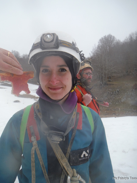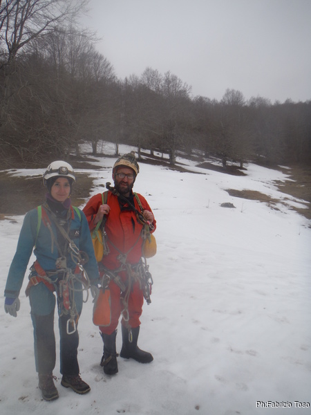 Dopo lo spuntino si parte per la salita. Valerio sale per primo, lo segue Fabio. Barbara, Giuseppe ed io procediamo in coda. Come terzo parto io, oramai il freddo si e’ impossessato di me, ma la salita lo sconfigge presto. Dopo di me sale Giuseppe. Andiamo ad un frazionamento di distanza l’uno dall’altro. Al secondo frazionamento muovo inavvertitamente una roccia col piede. Diventa instabile tutto un gruppo di rocce incastrate in una fessura. Le tengo ferme ed intanto chiedo a Barbara di mettersi al riparo ed a Giuseppe di raggiungermi prima che puo’. Ci assicuriamo ancora un paio di volte che Barbara sia al riparo poi…scateniamo l’inferno. tolto il primo sasso, di seguito cadono anche decine di altri. I piu’ grossi li spostiamo poco piu’ in alto senza farli cadere. Molti altri, della grandezza di una mela, cadono giu’ per la gioia di Barbara. Alla fine raggiungiamo una situazione abbastanza sicura. Mi riprometto, la prossima volta, di scendere, togliere la corda e fare pulizia per bene. Sara’ faticoso ma non si puo’ rischiare in questa maniera.